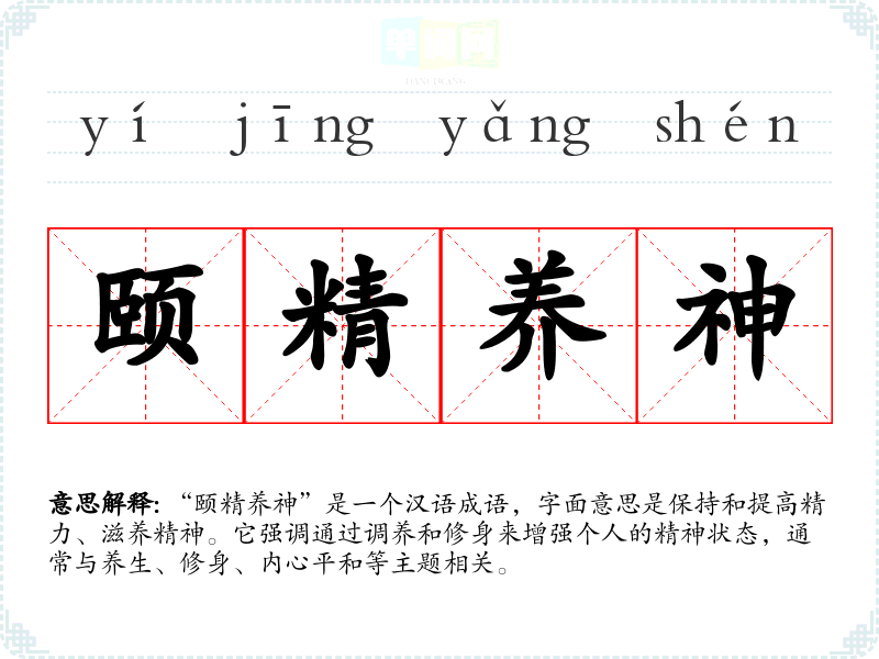 “颐精养神”是一个汉语成语,字面意思是保持和提高精力、滋养精神。它强调通过调养和修身来增强个人的精神状态,通常与养生、修身、内心平和等主题相关。