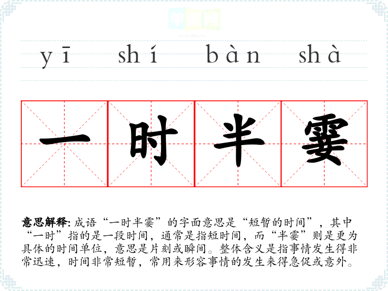 成语“一时半霎”的字面意思是“短暂的时间”,其中“一时”指的是一段时间,通常是指短时间,而“半霎”则是更为具体的时间单位,意思是片刻或瞬间。整体含义是指事情发生得非常迅速,时间非常短暂,常用来形容事情的发生来得急促或意外。
