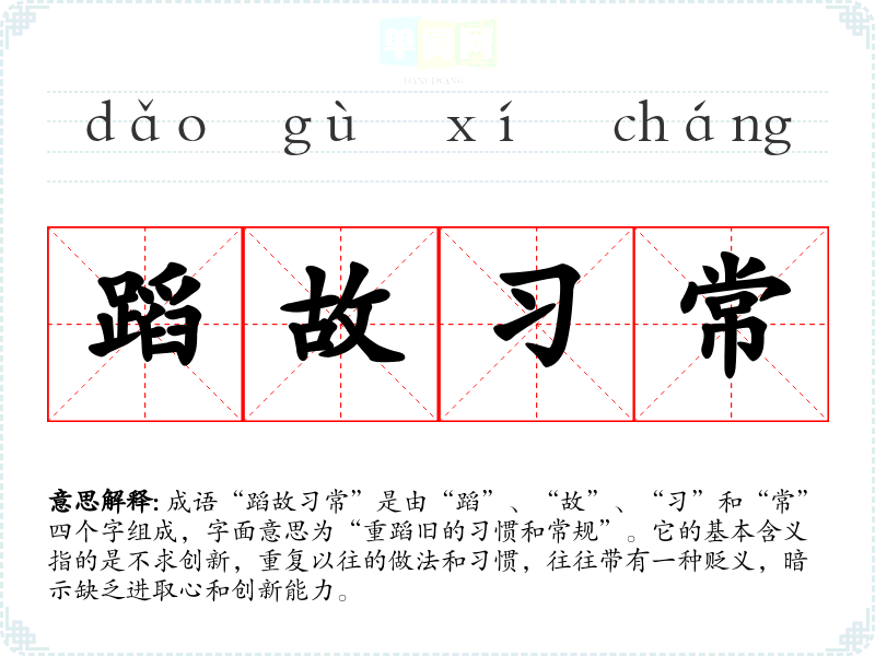 成语“蹈故常”是由“蹈”、“故”、“”和“常”四个字组成,字面意思为“重蹈旧的惯和常规”。它的基本含义指的是不求创新,重复以往的做法和惯,往往带有一种贬义,暗示缺乏进取心和创新能力。