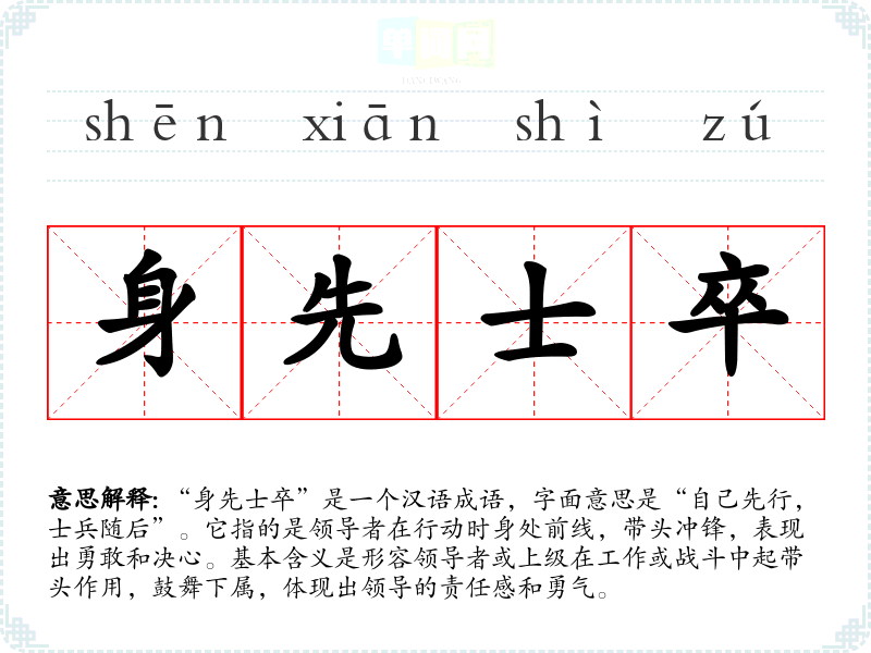 “身先士卒”是一个汉语成语,字面意思是“自己先行,士兵随后”。它指的是领导者在行动时身处前线,带头冲锋,表现出勇敢和决心。基本含义是形容领导者或上级在工作或战斗中起带头作用,鼓舞下属,体现出领导的责任感和勇气。