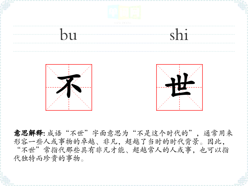 成语“不世”字面意思为“不是这个时代的”,通常用来形容一些人或事物的卓越、非凡,超越了当时的时代背景。因此,“不世”常指代那些具有非凡才能、超越常人的人或事,也可以指代独特而珍贵的事物。