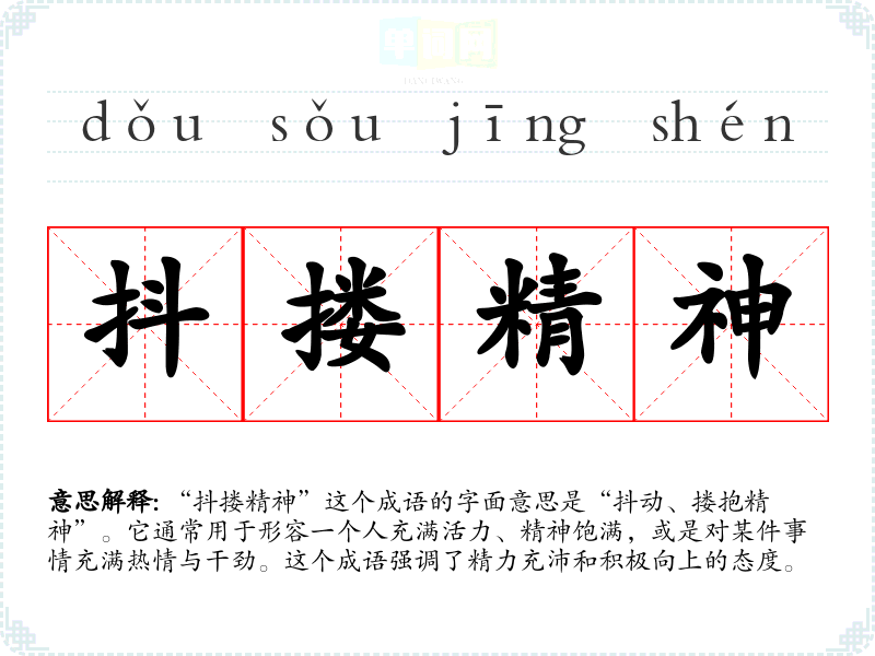 “抖搂精神”这个成语的字面意思是“抖动、搂抱精神”。它通常用于形容一个人充满活力、精神饱满,或是对某件事情充满热情与干劲。这个成语强调了精力充沛和积极向上的态度。