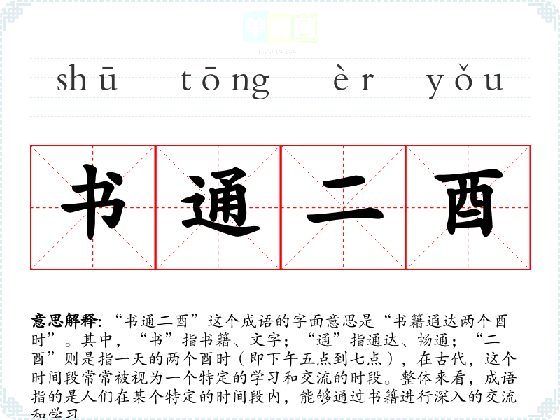 “书通二酉”这个成语的字面意思是“书籍通达两个酉时”。其中,“书”指书籍、文字;“通”指通达、畅通;“二酉”则是指一天的两个酉时(即下午五点到七点),在古代,这个时间段常常被视为一个特定的学和交流的时段。整体来看,成语指的是人们在某个特定的时间段内,能够通过书籍进行深入的交流和学。