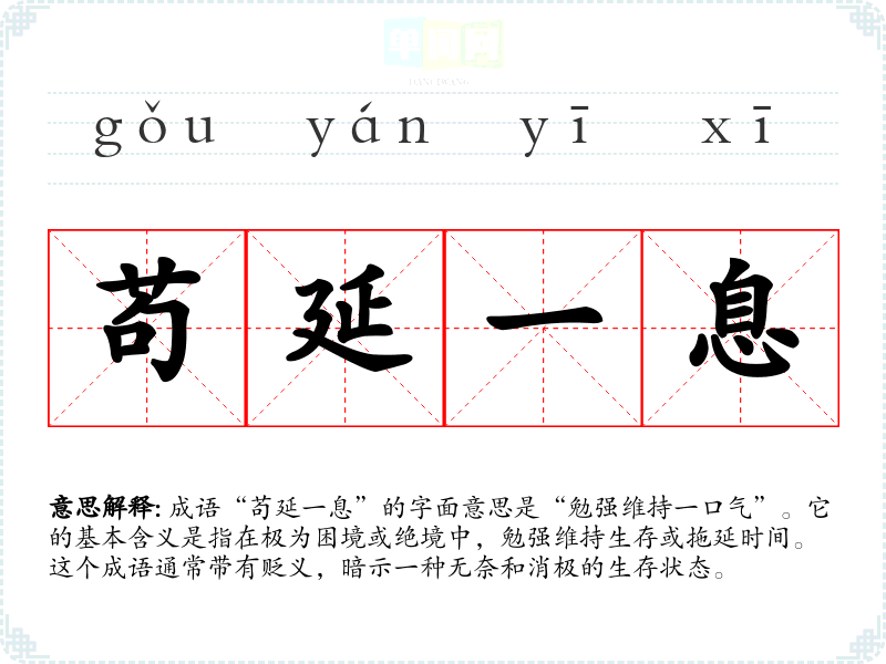 成语“苟延一息”的字面意思是“勉强维持一口气”。它的基本含义是指在极为困境或绝境中,勉强维持生存或拖延时间。这个成语通常带有贬义,暗示一种无奈和消极的生存状态。