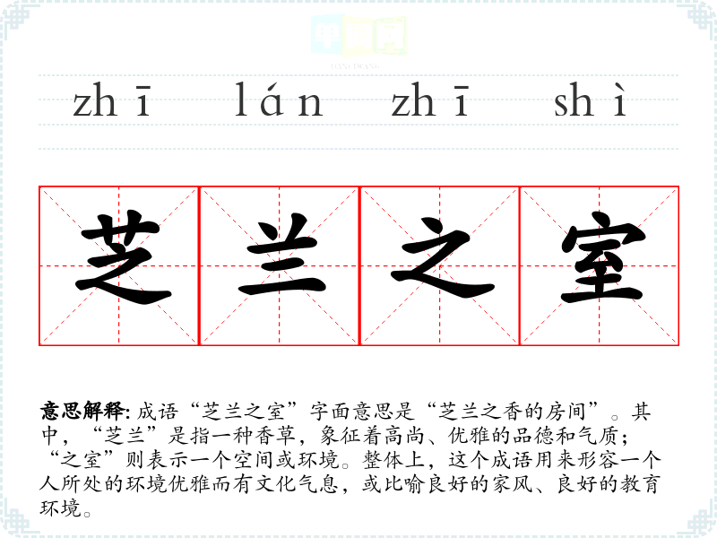 成语“芝兰之室”字面意思是“芝兰之香的房间”。其中,“芝兰”是指一种香草,象征着高尚、优雅的品德和气质;“之室”则表示一个空间或环境。整体上,这个成语用来形容一个人所处的环境优雅而有文化气息,或比喻良好的家风、良好的教育环境。