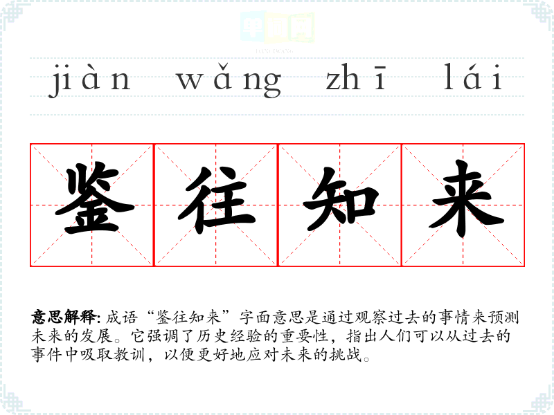 | 鉴往知来 | 鉴:审察或引为教训;往:过去;来:未来。根据以往的情形便知道以后怎样发生变化。 |