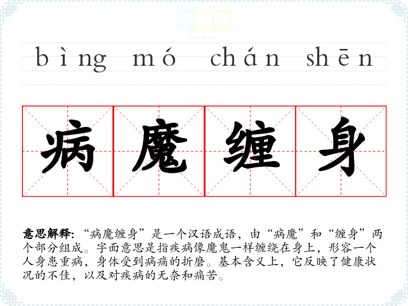 “病魔缠身”是一个汉语成语,由“病魔”和“缠身”两个部分组成。字面意思是指疾病像魔鬼一样缠绕在身上,形容一个人身患重病,身体受到病痛的折磨。基本含义上,它反映了健康状况的不佳,以及对疾病的无奈和痛苦。