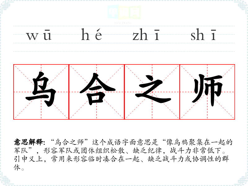 “乌合之师”这个成语字面意思是“像乌鸦聚集在一起的军队”,形容军队或团体组织松散、缺乏纪律,战斗力非常低下。引申义上,常用来形容临时凑合在一起、缺乏战斗力或协调性的群体。