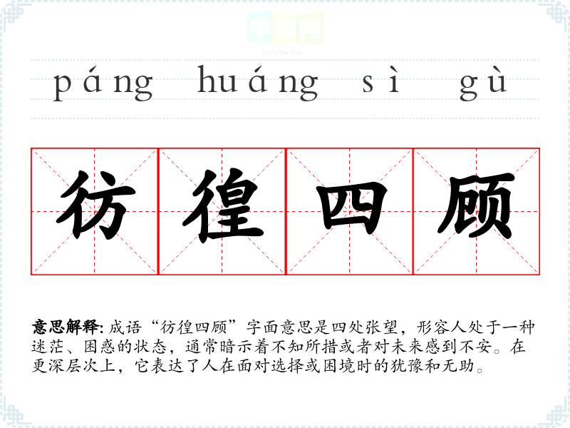 成语“彷徨四顾”字面意思是四处张望,形容人处于一种迷茫、困惑的状态,通常暗示着不知所措或者对未来感到不安。在更深层次上,它表达了人在面对选择或困境时的犹豫和无助。
