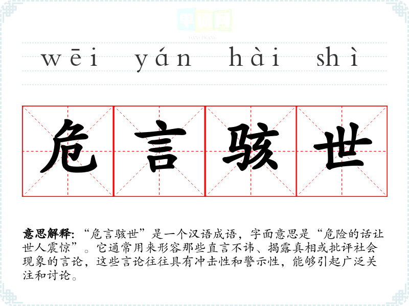 “危言骇世”是一个汉语成语,字面意思是“危险的话让世人震惊”。它通常用来形容那些直言不讳、揭露真相或批评社会现象的言论,这些言论往往具有冲击性和警示性,能够引起广泛关注和讨论。
