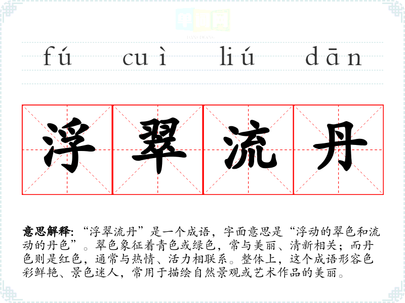“浮翠流丹”是一个成语,字面意思是“浮动的翠色和流动的丹色”。翠色象征着青色或绿色,常与美丽、清新相关;而丹色则是红色,通常与热情、活力相联系。整体上,这个成语形容色彩鲜艳、景色迷人,常用于描绘自然景观或艺术作品的美丽。