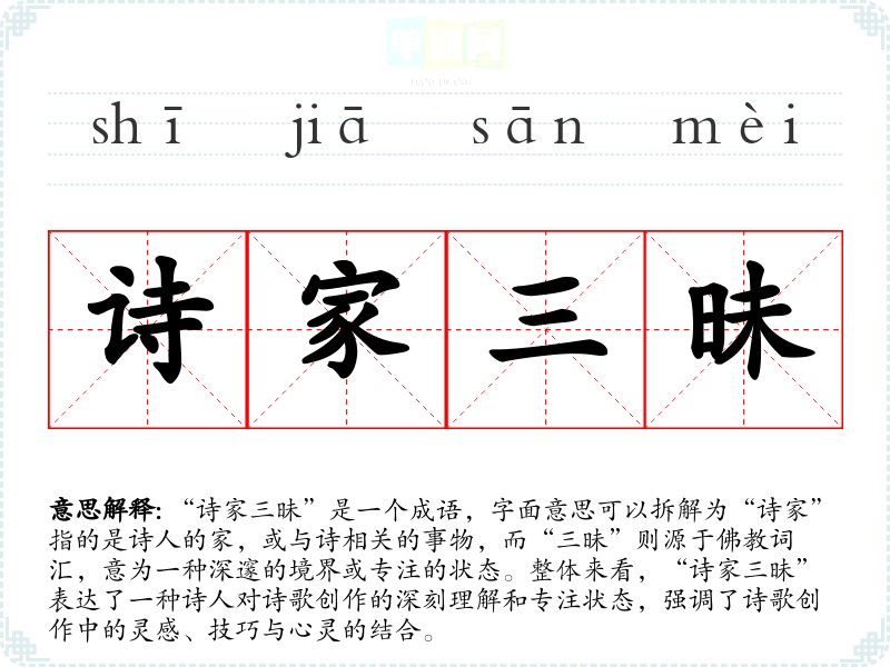 “诗家三昧”是一个成语,字面意思可以拆解为“诗家”指的是诗人的家,或与诗相关的事物,而“三昧”则源于**词汇,意为一种深邃的境界或专注的状态。整体来看,“诗家三昧”表达了一种诗人对诗歌创作的深刻理解和专注状态,强调了诗歌创作中的灵感、技巧与心灵的结合。