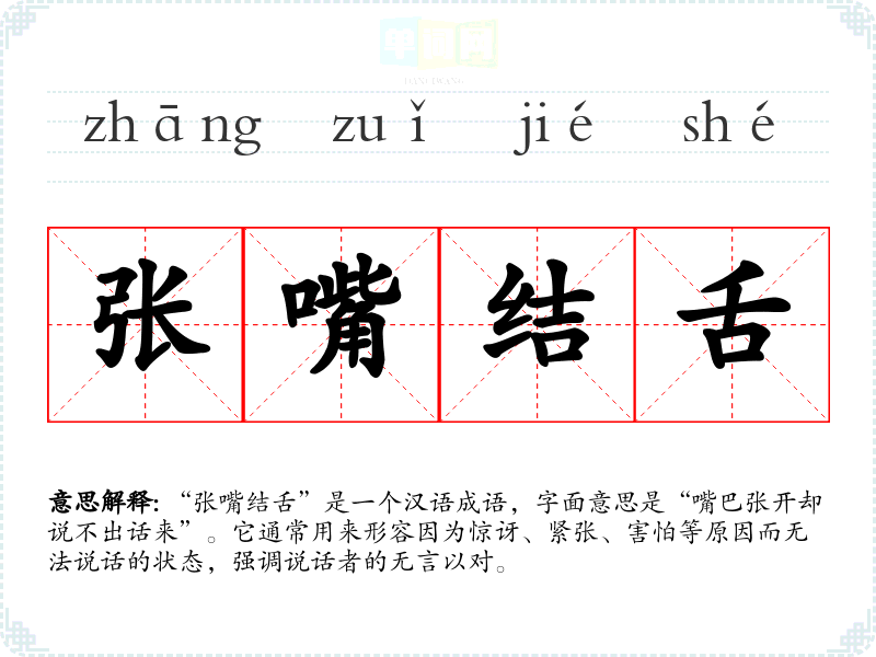 “张嘴结舌”是一个汉语成语,字面意思是“嘴巴张开却说不出话来”。它通常用来形容因为惊讶、紧张、害怕等原因而无法说话的状态,强调说话者的无言以对。