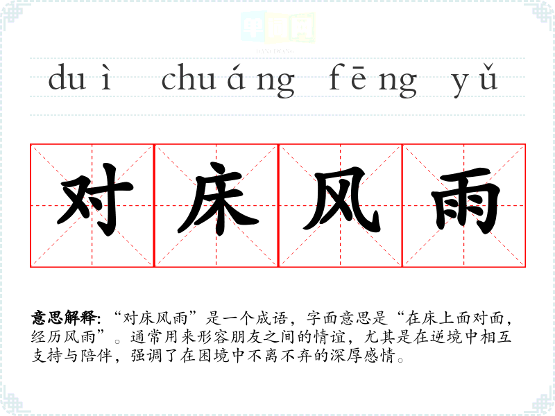 “对床风雨”是一个成语,字面意思是“在床上面对面,经历风雨”。通常用来形容朋友之间的情谊,尤其是在逆境中相互支持与陪伴,强调了在困境中不离不弃的深厚感情。