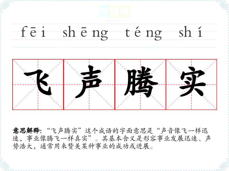 “飞声腾实”这个成语的字面意思是“声音像飞一样迅速,事业像腾飞一样真实”。其基本含义是形容事业发展迅速、声势浩大,通常用来赞美某种事业的成功或进展。