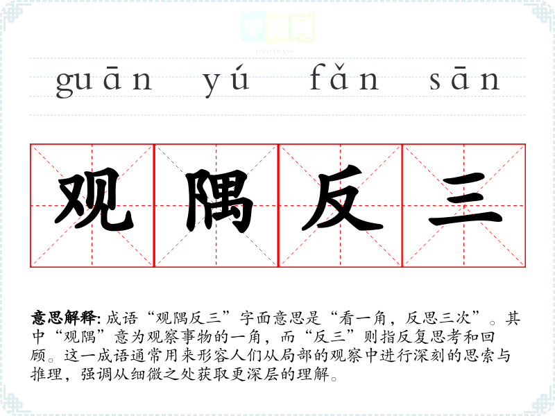 成语“观隅反三”字面意思是“看一角,反思三次”。其中“观隅”意为观察事物的一角,而“反三”则指反复思考和回顾。这一成语通常用来形容人们从局部的观察中进行深刻的思索与推理,强调从细微之处获取更深层的理解。