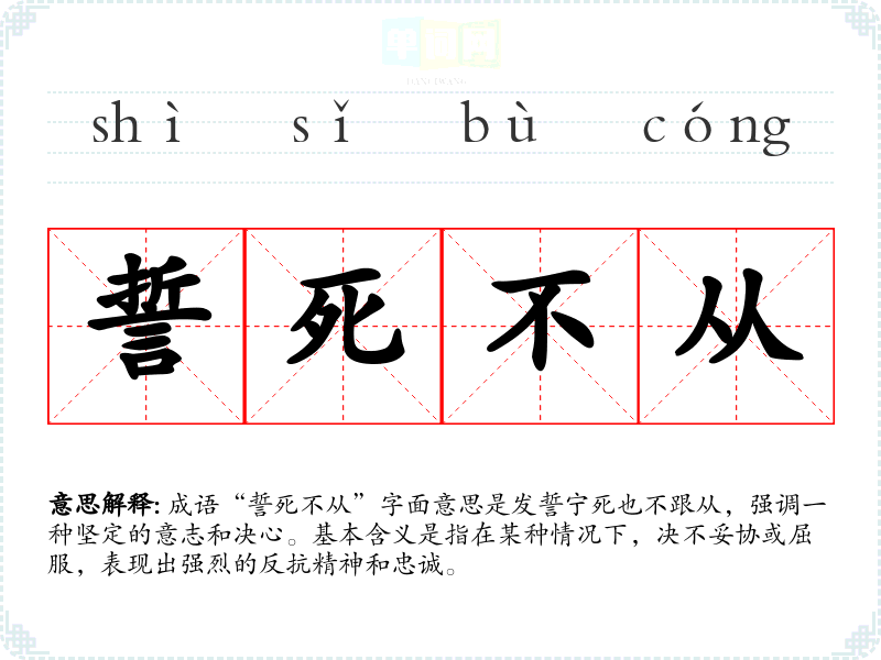 “誓死不从”出自古代文献,虽然具体的出处并不明确,但其构成的字词可以追溯到古代军事和忠臣为国捐躯的典故。在历史上,许多忠臣和将领在面临生死抉择时,常常表达出类似的誓言,表现出对理想和信念的坚定。
