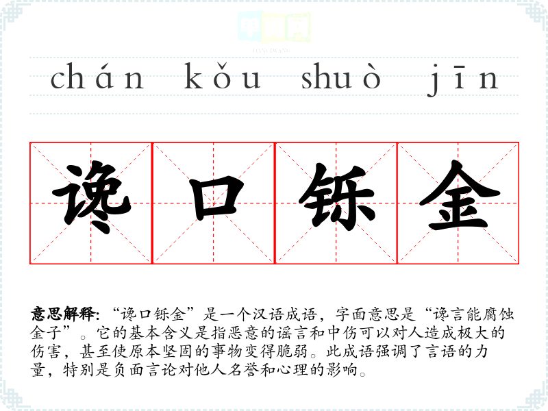 “谗口铄金”是一个汉语成语,字面意思是“谗言能腐蚀金子”。它的基本含义是指恶意的谣言和中伤可以对人造成极大的伤害,甚至使原本坚固的事物变得脆弱。此成语强调了言语的力量,特别是负面言论对他人名誉和心理的影响。