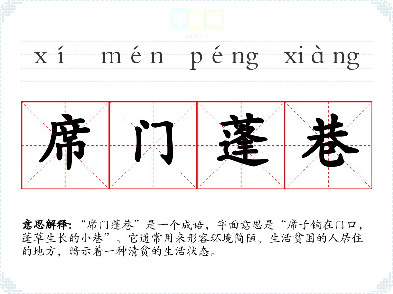 - 反义成语:富丽堂皇、锦衣玉食,这些成语描绘了奢华和富裕的生活状态,与“席门蓬巷”形成鲜明对比。