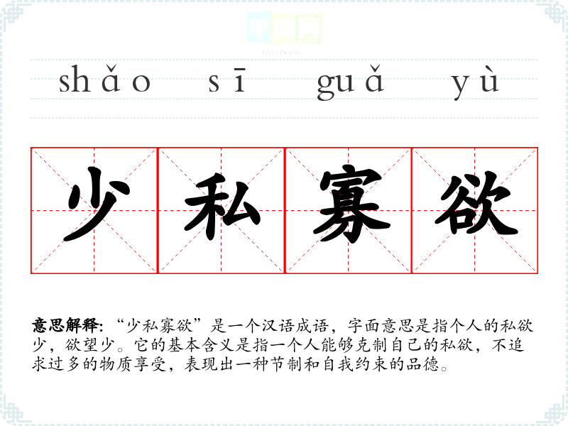 “少私寡欲”是一个汉语成语,字面意思是指个人的私欲少,欲望少。它的基本含义是指一个人能够克制自己的私欲,不追求过多的物质享受,表现出一种节制和自我约束的品德。