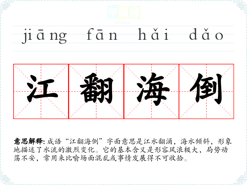 成语“江翻海倒”字面意思是江水翻涌,海水倾斜,形象地描述了水流的激烈变化。它的基本含义是形容风浪极大,局势动荡不安,常用来比喻场面混乱或事情发展得不可收拾。