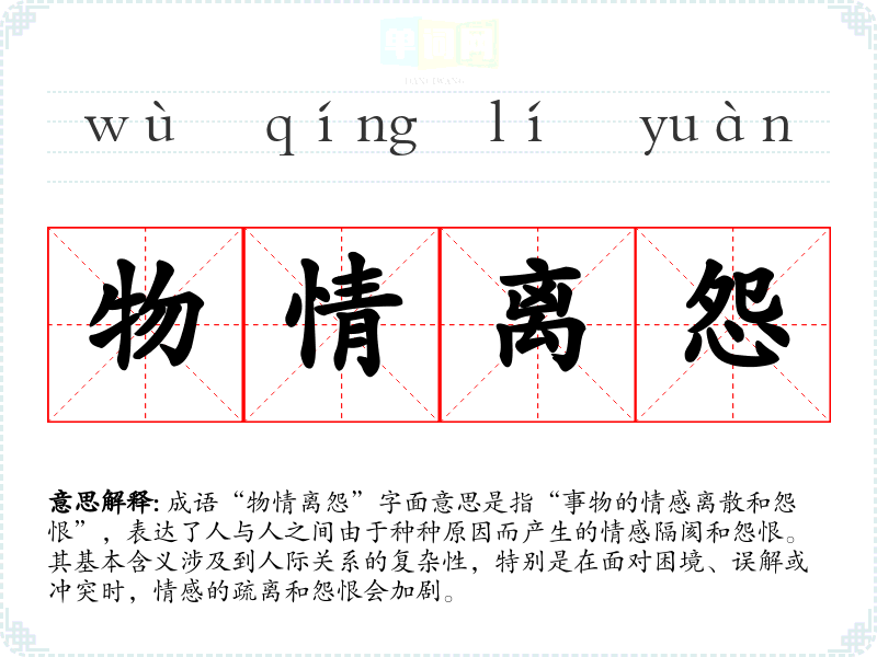 成语“物情离怨”字面意思是指“事物的情感离散和怨恨”,表达了人与人之间由于种种原因而产生的情感隔阂和怨恨。其基本含义涉及到人际关系的复杂性,特别是在面对困境、误解或冲突时,情感的疏离和怨恨会加剧。