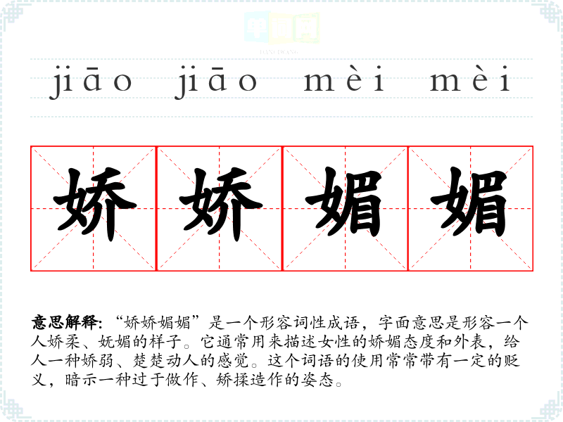 “娇娇媚媚”是一个形容词性成语,字面意思是形容一个人娇柔、妩媚的样子。它通常用来描述女性的娇媚态度和外表,给人一种娇弱、楚楚动人的感觉。这个词语的使用常常带有一定的贬义,暗示一种过于做作、矫揉造作的姿态。