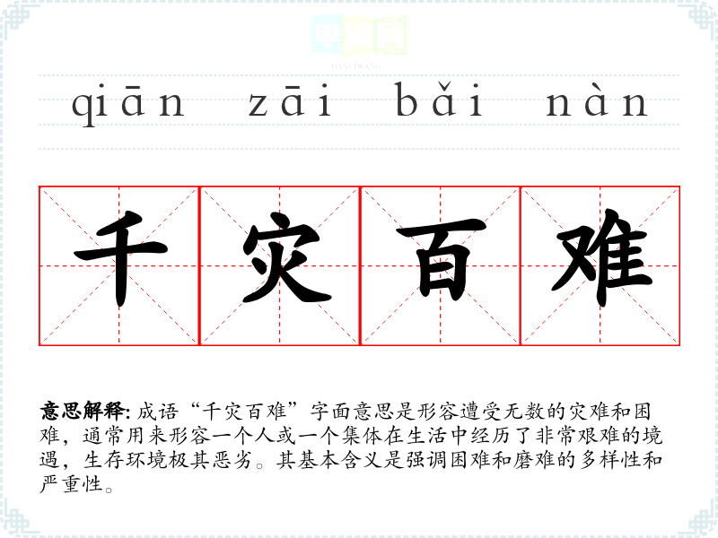 成语“千灾百难”字面意思是形容遭受无数的灾难和困难,通常用来形容一个人或一个集体在生活中经历了非常艰难的境遇,生存环境极其恶劣。其基本含义是强调困难和磨难的多样性和严重性。