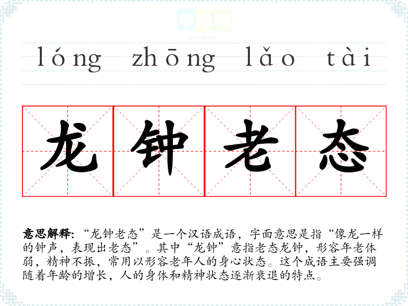 - “老态龙钟”:形容年老体弱的状态,和“龙钟老态”意思相近。