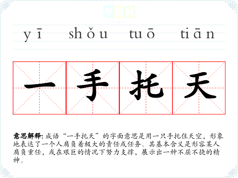 成语“一手托天”的字面意思是用一只手托住天空,形象地表达了一个人肩负着极大的责任或任务。其基本含义是形容某人肩负重任,或在艰巨的情况下努力支撑,展示出一种不屈不挠的精神。
