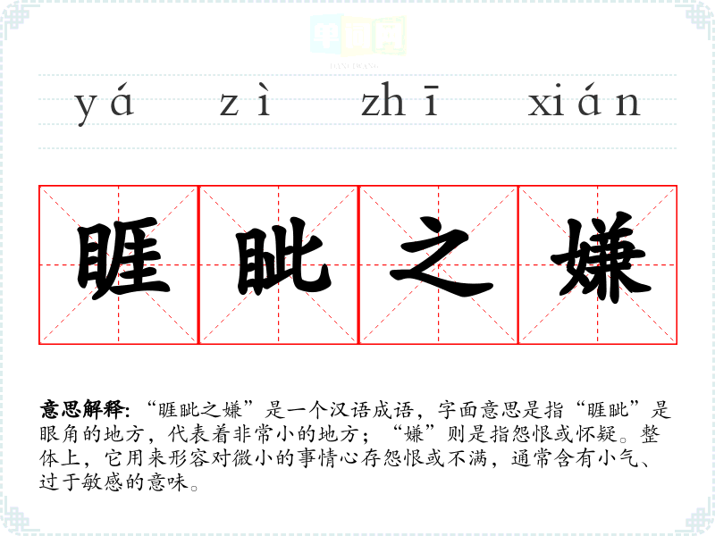 “睚眦之嫌”是一个汉语成语,字面意思是指“睚眦”是眼角的地方,代表着非常小的地方;“嫌”则是指怨恨或怀疑。整体上,它用来形容对微小的事情心存怨恨或不满,通常含有小气、过于敏感的意味。