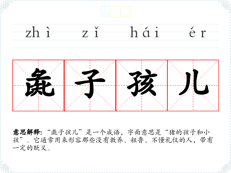 “彘子孩儿”是一个成语,字面意思是“猪的孩子和小孩”。它通常用来形容那些没有教养、粗鲁、不懂礼仪的人,带有一定的贬义。