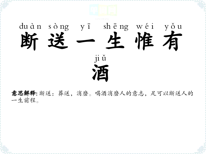 | 以酒浇愁 | 借助酒来排遗心中的积郁。 |