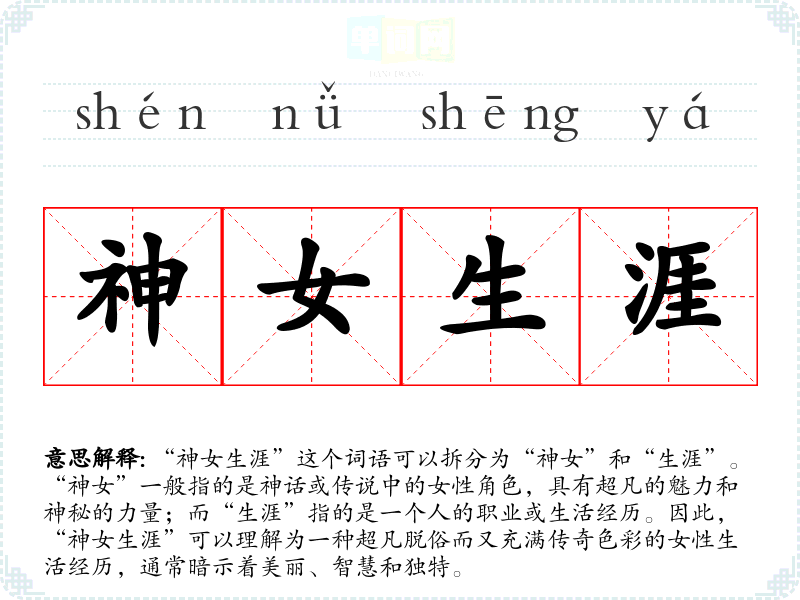 “神女生涯”并不是一个传统的成语,而是一个现代词汇,可能源于对神话或传说中女性人物生涯的描绘。在**古代文化中,有许多神话故事中描写了神女的形象,如嫦娥、西王母等,她们的生活经历常常充满了传奇与神秘色彩。