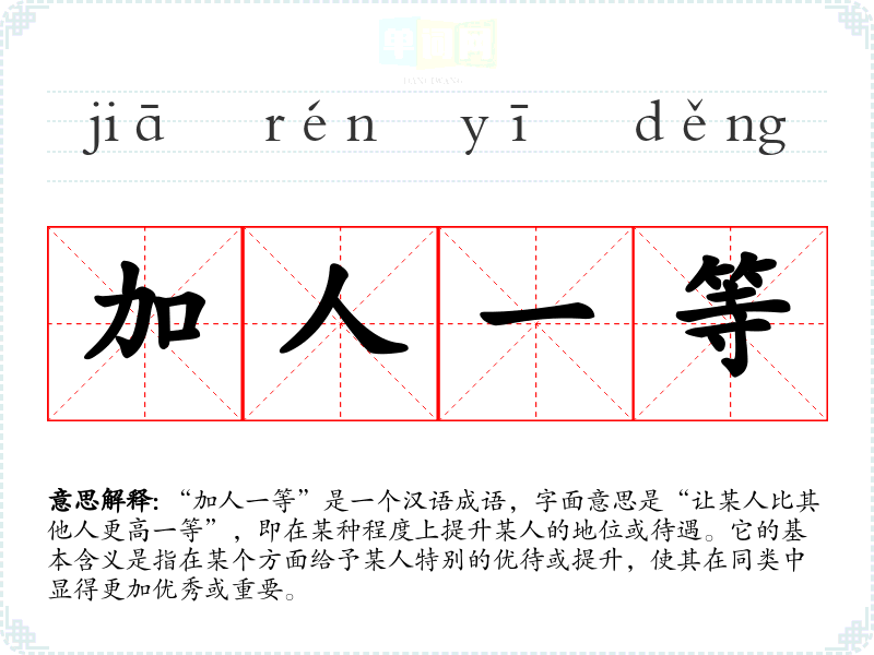 “加人一等”是一个汉语成语,字面意思是“让某人比其他人更高一等”,即在某种程度上提升某人的地位或待遇。它的基本含义是指在某个方面给予某人特别的优待或提升,使其在同类中显得更加优秀或重要。