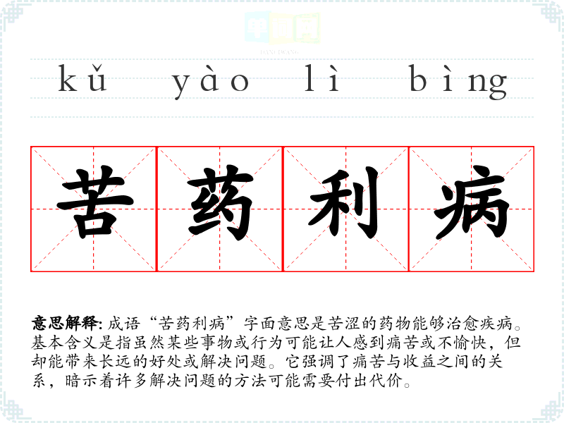 成语“苦药利病”字面意思是苦涩的药物能够治愈疾病。基本含义是指虽然某些事物或行为可能让人感到痛苦或不愉快,但却能带来长远的好处或解决问题。它强调了痛苦与收益之间的关系,暗示着许多解决问题的方法可能需要付出代价。