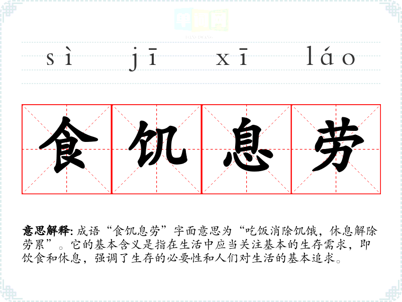 成语“食饥息劳”字面意思为“吃饭消除饥饿,休息解除劳累”。它的基本含义是指在生活中应当关注基本的生存需求,即饮食和休息,强调了生存的必要性和人们对生活的基本追求。