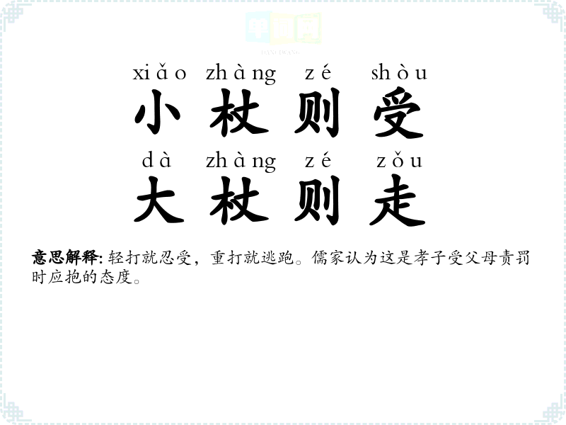 | 小杖则受,大杖则走 | 轻打就忍受,重打就逃跑。儒家认为这是孝子受父母责罚时应抱的态度。 |