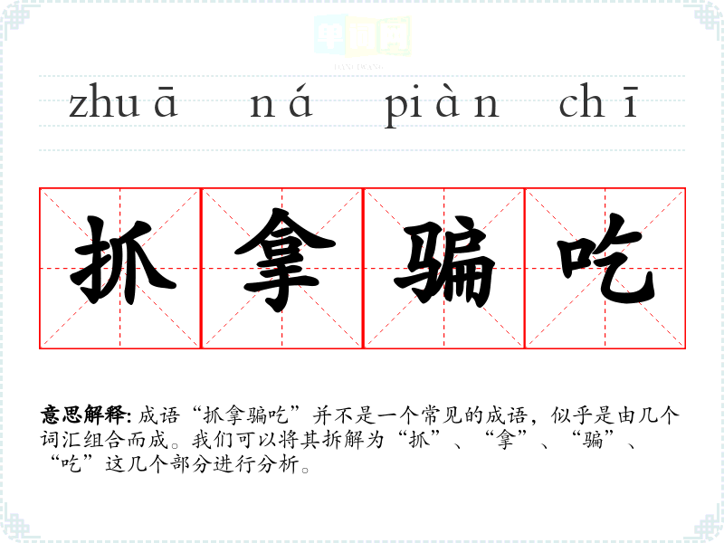 成语“抓拿骗吃”并不是一个常见的成语,似乎是由几个词汇组合而成。我们可以将其拆解为“抓”、“拿”、“骗”、“吃”这几个部分进行分析。