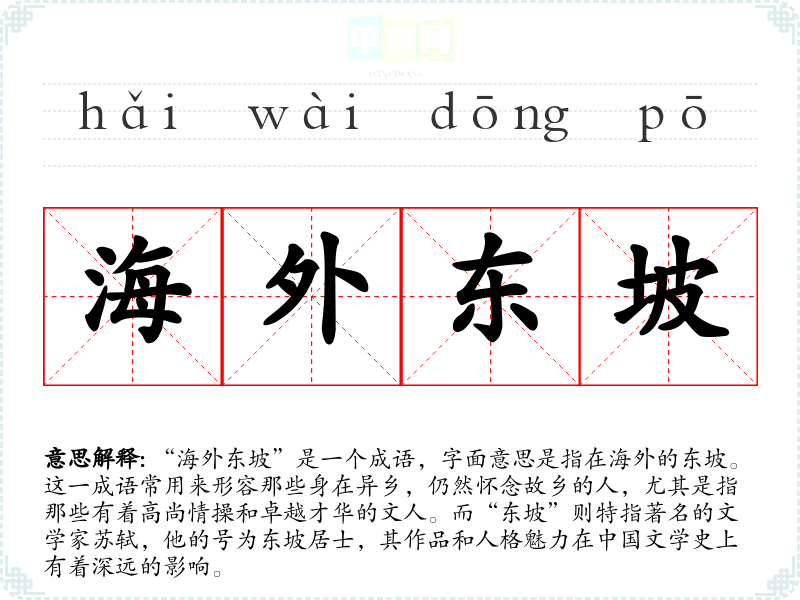 “海外东坡”源于苏轼的生平经历。苏轼因政治原因曾多次被贬,后期在黄州(今湖北省黄冈市)生活时,写下了大量脍炙人口的诗词,其中有许多表达了对故乡的思念和对生活的感悟。此成语借用苏轼的名字,表现出在异乡的人们对故乡的情感和对理想生活的追求。