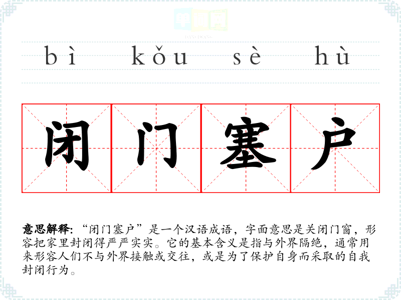 “闭门塞户”是一个汉语成语,字面意思是关闭门窗,形容把家里封闭得严严实实。它的基本含义是指与外界隔绝,通常用来形容人们不与外界接触或交往,或是为了保护自身而采取的自我封闭行为。
