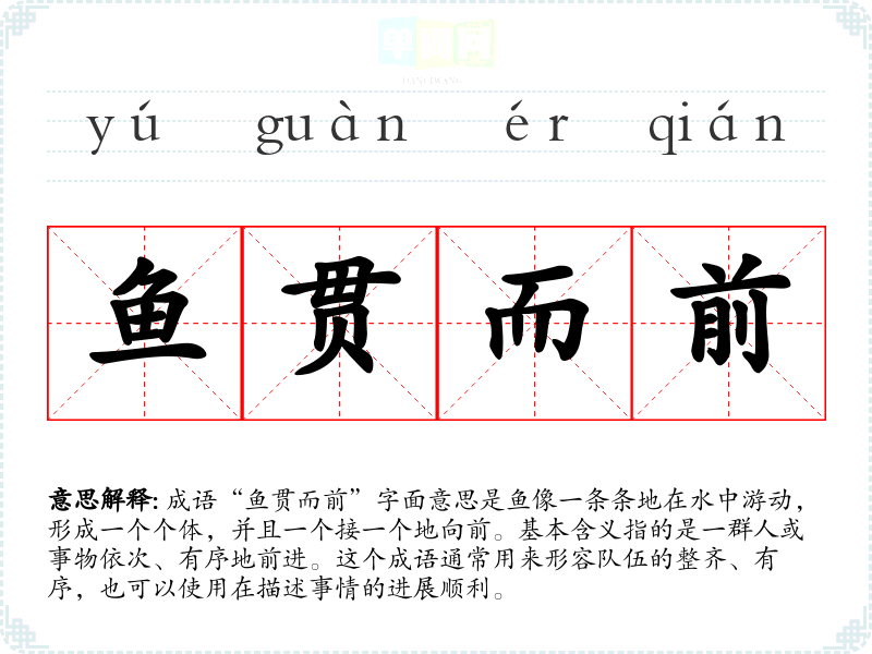 成语“鱼贯而前”字面意思是鱼像一条条地在水中游动,形成一个个体,并且一个接一个地向前。基本含义指的是一群人或事物依次、有序地前进。这个成语通常用来形容队伍的整齐、有序,也可以使用在描述事情的进展顺利。