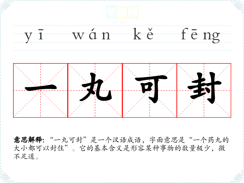 “一丸可封”是一个汉语成语,字面意思是“一个药丸的大小都可以封住”。它的基本含义是形容某种事物的数量极少,微不足道。