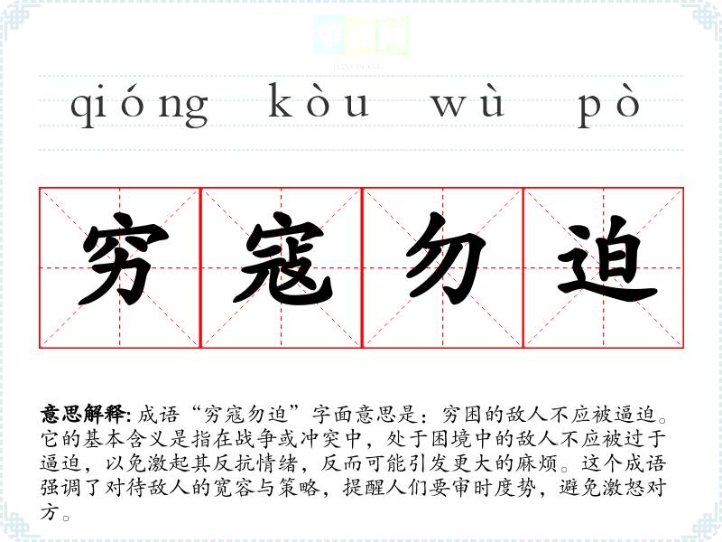 成语“穷寇勿迫”字面意思是:穷困的敌人不应被逼迫。它的基本含义是指在战争或冲突中,处于困境中的敌人不应被过于逼迫,以免激起其反抗情绪,反而可能引发更大的麻烦。这个成语强调了对待敌人的宽容与策略,提醒人们要审时度势,避免激怒对方。