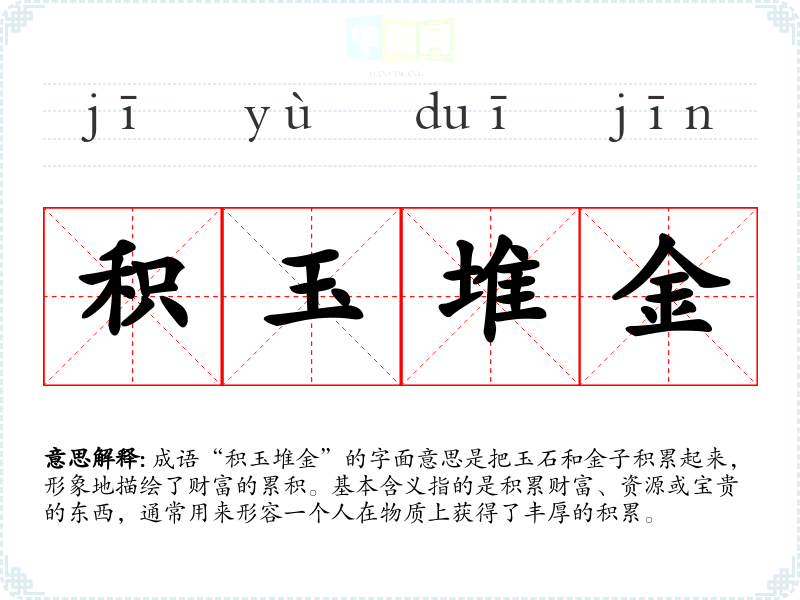 成语“积玉堆金”的字面意思是把玉石和金子积累起来,形象地描绘了财富的累积。基本含义指的是积累财富、资源或宝贵的东西,通常用来形容一个人在物质上获得了丰厚的积累。