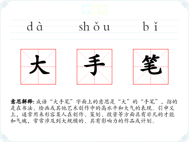 成语“大手笔”字面上的意思是“大”的“手笔”,指的是在书法、绘画或其他艺术创作中的高水平和大气的表现。引申义上,通常用来形容某人在创作、策划、投资等方面具有非凡的才能和气魄,常常涉及到***的、具有影响力的作品或计划。
