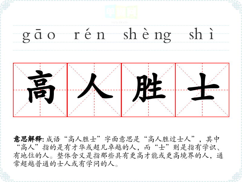 成语“高人胜士”字面意思是“高人胜过士人”,其中“高人”指的是有才华或超凡卓越的人,而“士”则是指有学识、有地位的人。整体含义是指那些具有更高才能或更高境界的人,通常超越普通的士人或有学问的人。