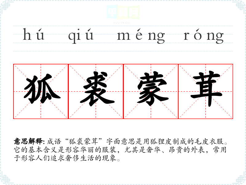 成语“狐裘蒙茸”字面意思是用狐狸皮制成的毛皮衣服。它的基本含义是形容华丽的服装,尤其是奢华、昂贵的外表,常用于形容人们追求奢侈生活的现象。