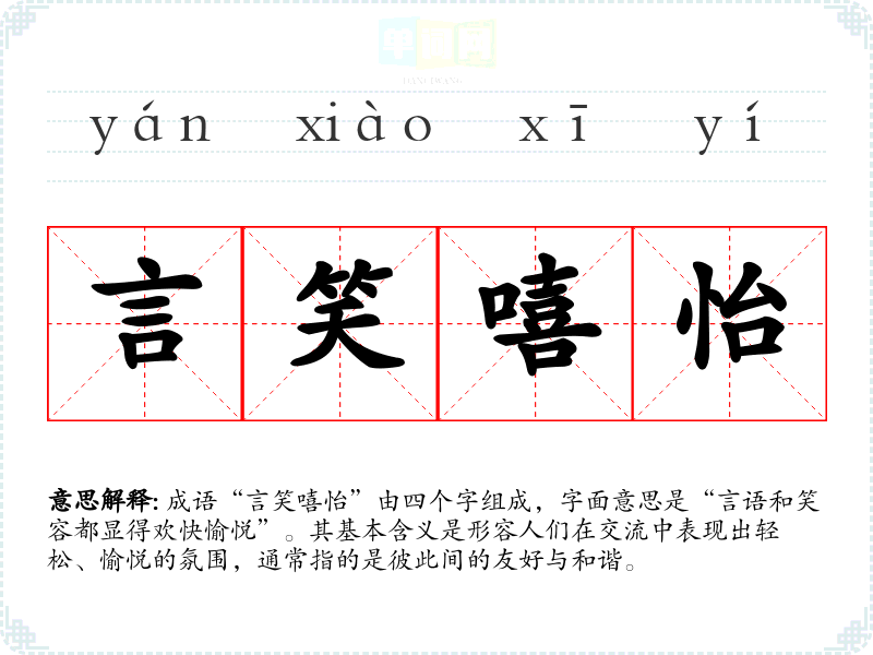 成语“言笑嘻怡”由四个字组成,字面意思是“言语和笑容都显得欢快愉悦”。其基本含义是形容人们在交流中表现出轻松、愉悦的氛围,通常指的是彼此间的友好与和谐。