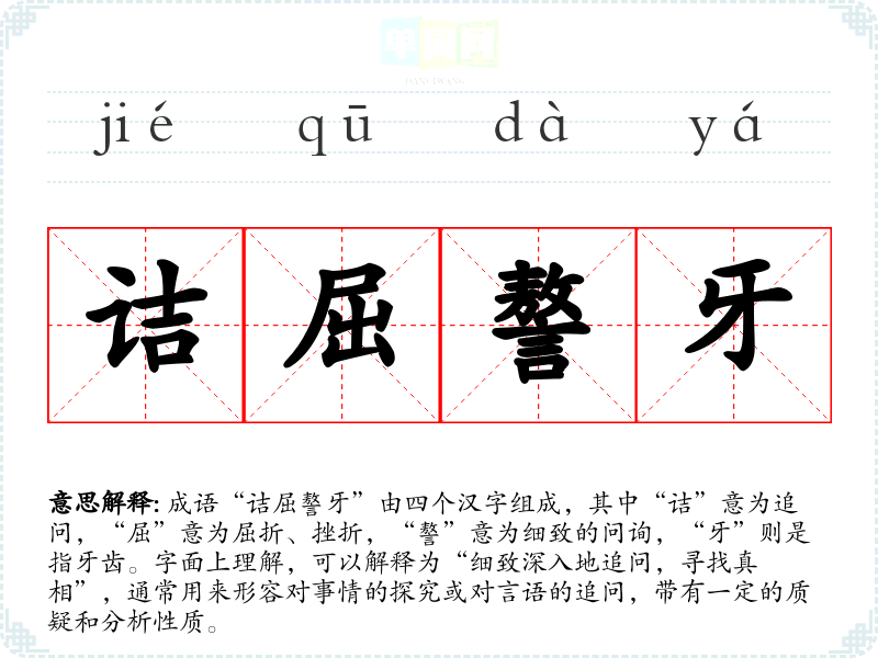 成语“诘屈謷牙”由四个汉字组成,其中“诘”意为追问,“屈”意为屈折、挫折,“謷”意为细致的问询,“牙”则是指牙齿。字面上理解,可以解释为“细致深入地追问,寻找真相”,通常用来形容对事情的探究或对言语的追问,带有一定的质疑和分析性质。